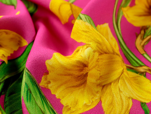 This deadstock dressmaking fabric has a wonderful bright yellow daffodil print on a wonderful magenta pink background.