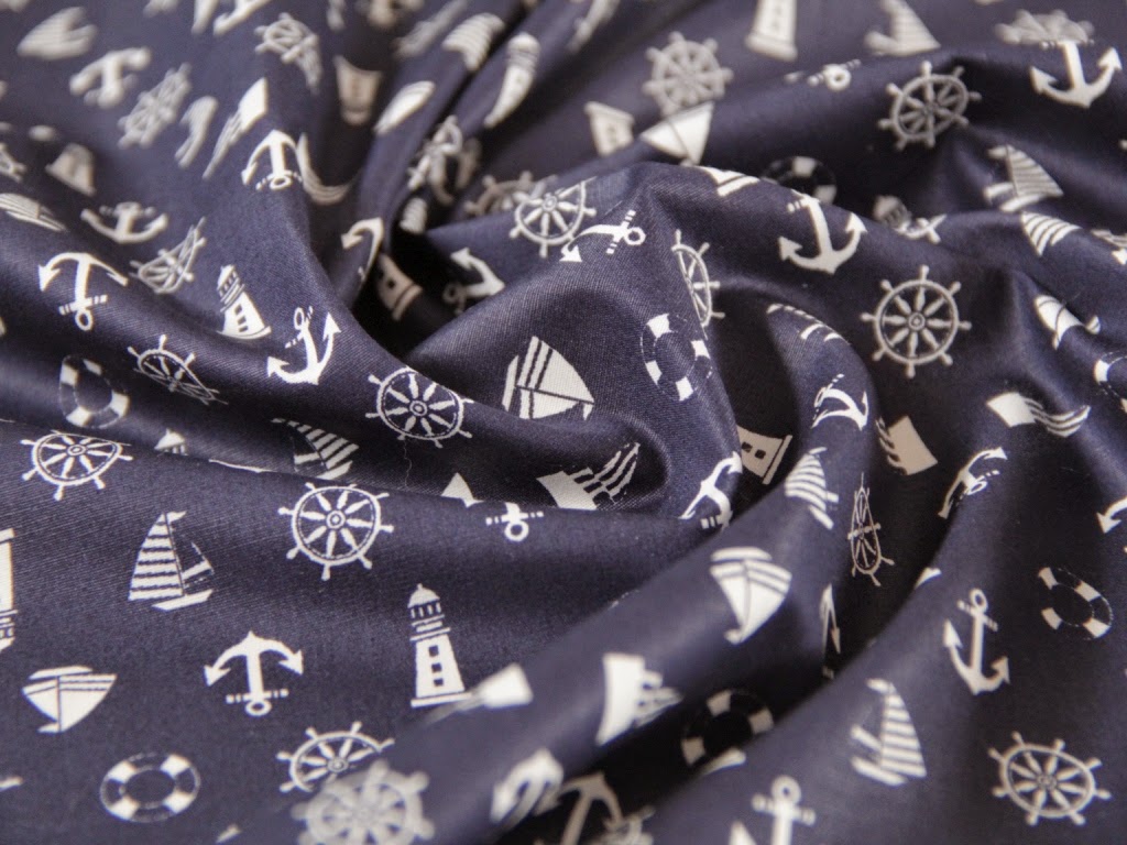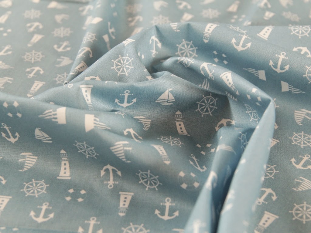 Ahoy cotton poplin comes in seaside colours the dreamy sky blue, then nautical navy and red topped with a white themed print including lighthouses, ships wheels and sailing boats.
