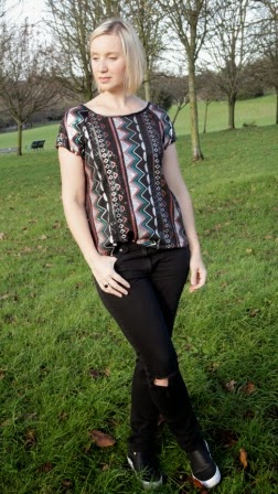 I chose this totally over the top sequin fabric so I needed a basic pattern to make it with. I live in skinny black jeans both for staying in and going out and my favourite style is to pair them with a bright top. Party time is no different so I decided on the Belcarra blouse from Sewaholic. I have never made this before (I don't know why it is totally the kind of top I wear everyday)