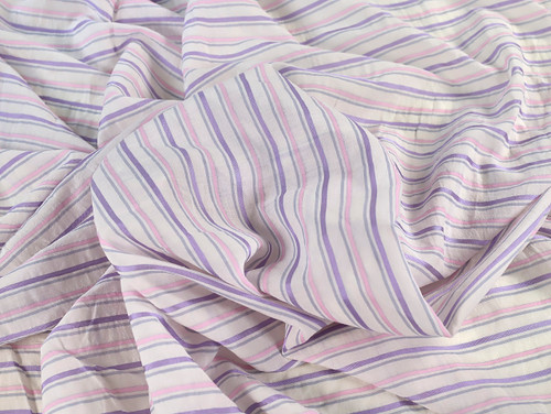 A wonderful deadstock cotton lawn weight dressmaking fabric with a yarn dyes stripe in light pink and purple on an ivory background.