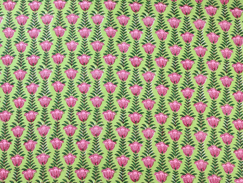 A stunning block printed cotton dressmaking fabric, hand printed in India featuring a pretty pink flower on a green backgound.