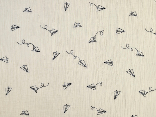 A stunning cotton double gauze dressmaking fabric with a fun embroidered paper plane design.