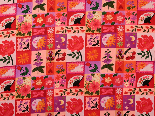 Introducing an exclusive design from Fabric Godmother: a retro-inspired postcard adorned with vibrant flowers, cherries, suns, and moons, in captivating shades of red, pink, and lilac. This dressmaking fabric is printed on a soft, drapey viscose crepe dressmaking fabric making it perfect for creating elegant dresses, skirts, wide leg trousers and blouses.