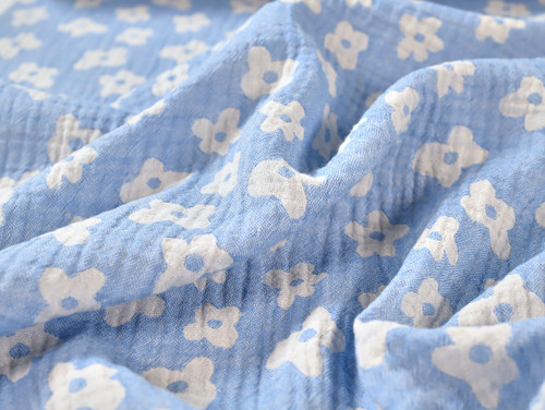 This beautiful cotton double gauze dressmaking fabric features a pretty white daisy on a pale blue background. You can also use the reverse of this fabric as a contrast to your makes.