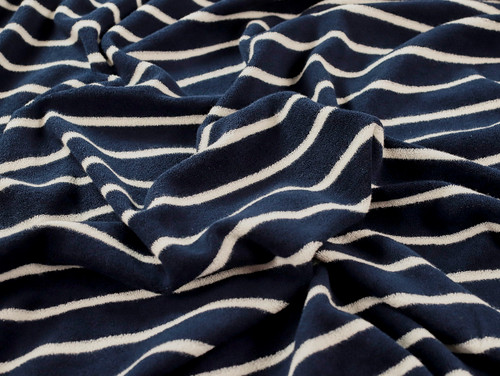 Stretch Stripe Terry Towelling - Navy is 155cm wide and is 80% cotton, 20% poly and approximately 245gsm. It has approx. 40% stretch along the width.