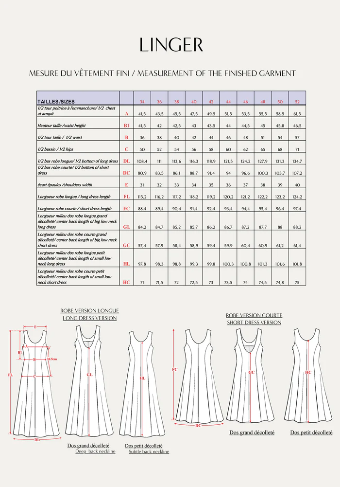 LINGER is the dress that blends femininity with effortless style. The pattern features precise panel construction for a beautifully clean, sculpted silhouette. The shape is long and fluid, light to wear, and ultra comfortable thanks to its wide straps. The pattern comes in 4 versions: irresistible with a deep neckline that reinvents the racerback, more everyday with a higher neckline (bra-friendly!), unforgettable in a long version and playful in a short version. Its clean, minimalist cut lends itself to every mood and every occasion.