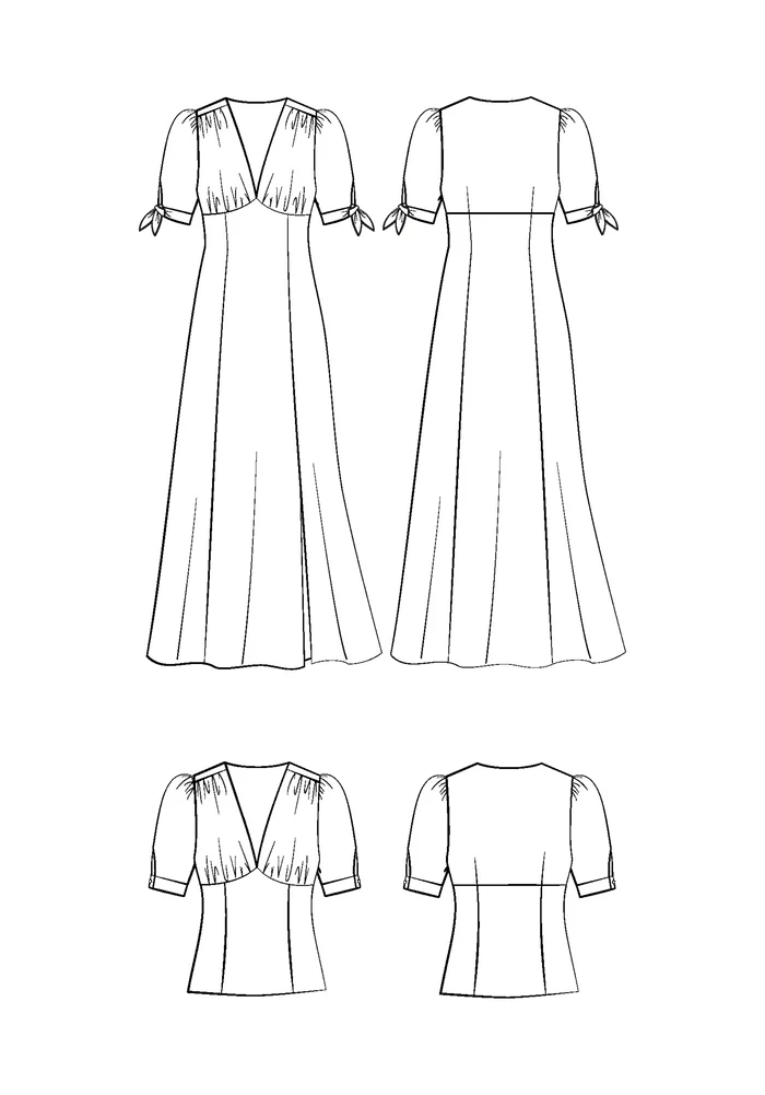 A stunningly feminine dress has joined the Maison Fauve wardrobe meet Rosalie, a true gem that will beautifully enhance your silhouette. Its plunging V-neckline is carefully designed to flatter the bust without revealing too much, while the fitted bodice creates a graceful shape without feeling too tight. The skirt features a slit, adding both ease of movement and an elegant flow with every step. The sleeves come with two finishing options: a wide tie closure for a soft, romantic touch or a buttoned cuff for a more structured look. And for even more sewing joy, the pattern also includes a chic bustier-style top, perfect for summer!