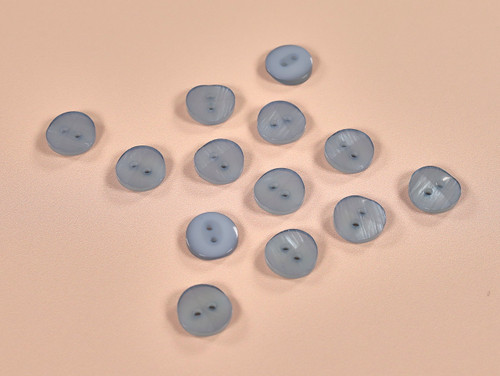 A stunning two hole button with a slightly curved middle with a super shiny light blue coating that really shines in the light.