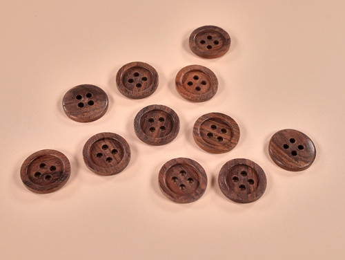 A beautiful wooden four hole button with a satin finish in a timeless dark brown colour, this button is made out of wood which provides it with strength and it has a matt wooden back.