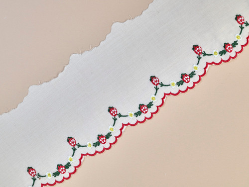 Add a charming, vintage-inspired touch to your projects with this embroidered cotton trim featuring sweet red strawberries and delicate white daisies.