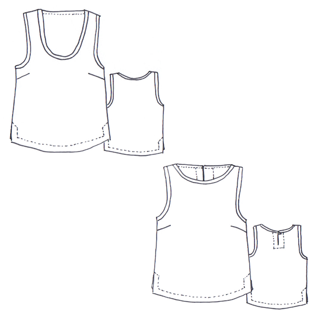 The Kate Top is a cropped, boxy sleeveless singlet style that comes with two neckline variations and a wide hemline with side split feature and exposed neckline and armhole binding. View A features a scooped neckline and View B features a higher neckline with keyhole back opening plus button rouleau loop. This style is the perfect wardrobe staple and can be worn underneath jackets and cardigans or on its own during the warmer months