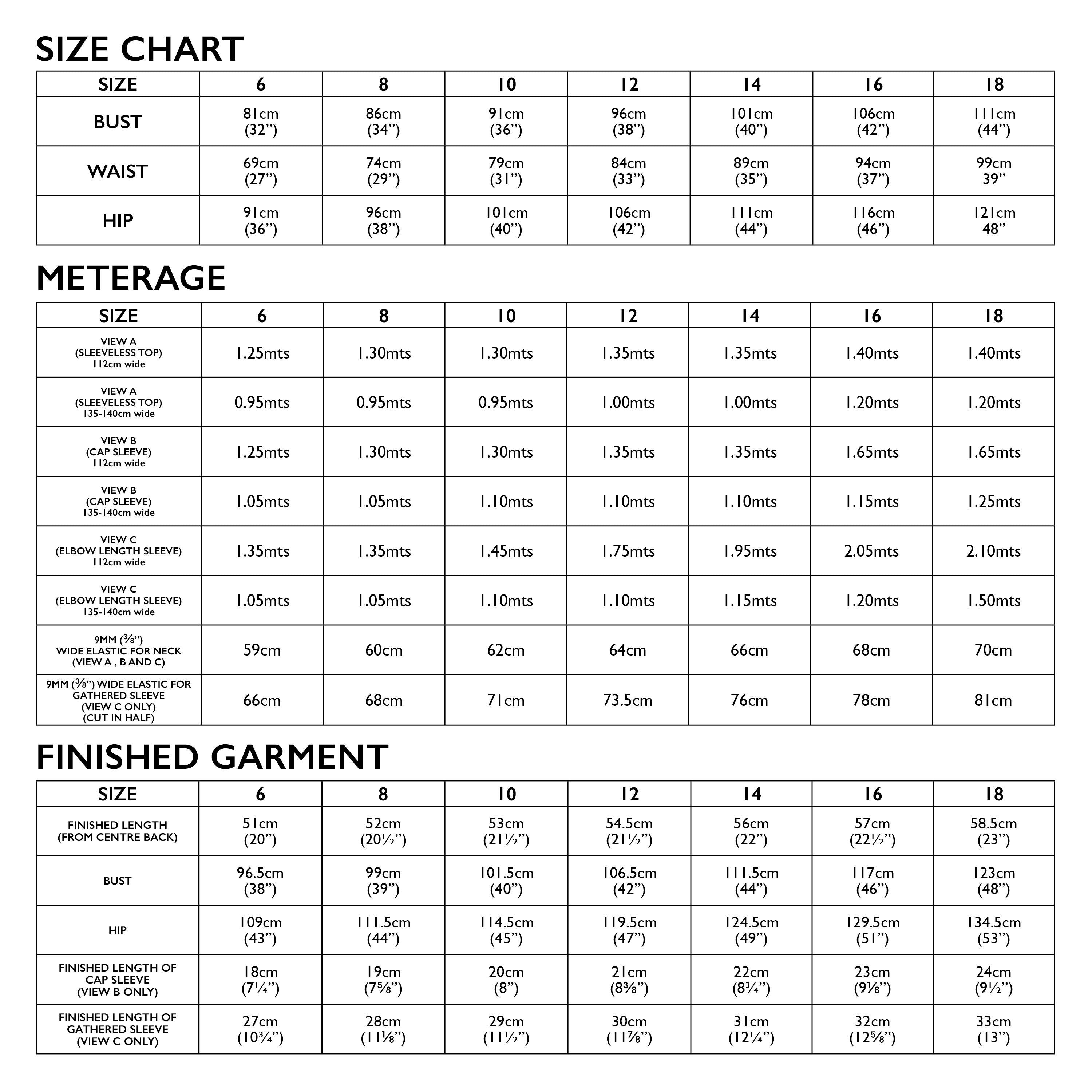 The Rae Top is a relaxed pull-on top with stylish design features including a wide, gathered neckline. The pattern includes options for a sleek sleeveless look with bound armholes (View A), cap sleeves (View B) or soft, elbow length sleeves with gathered hems (View C).